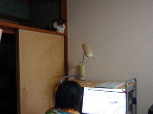 3度目は、2008年です。家出先は下の階のおうちですが、真下のおうちではありません。レイアウト等全く違うのですが、このおうちしかドアが空いていなかったのでしょう。首輪に鈴が付いていて音がするので気づかれたようです。家具の隙間に入り、「フー」と吠えてつかませないので、迎えに行きました。2日間の家出でした。 |